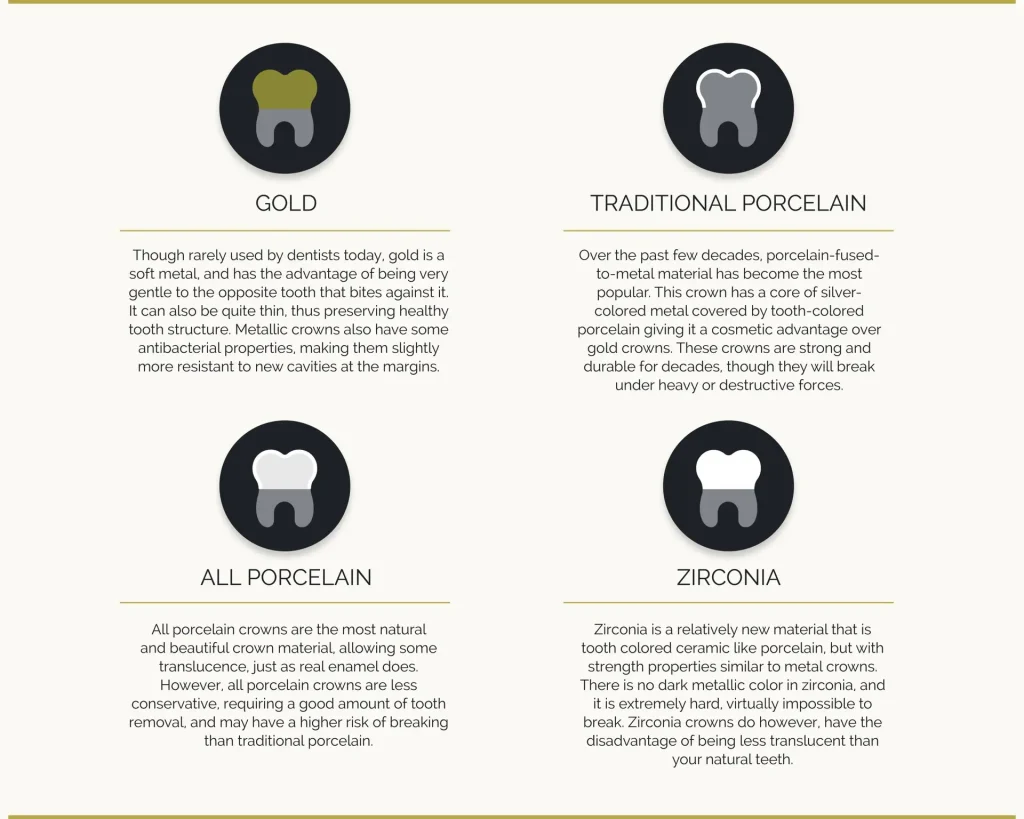 Zirconia is a relatively new material that is tooth colored ceramic like porcelain, but with strength properties more similar to that of metal crowns. There is no dark metallic color in zirconia, and it is extremely hard, virtually impossible to break. Their cosmetic appearance is almost as nice as all porcelain crowns. Zirconia crowns do however, have the disadvantage of being less translucent than your natural teeth.